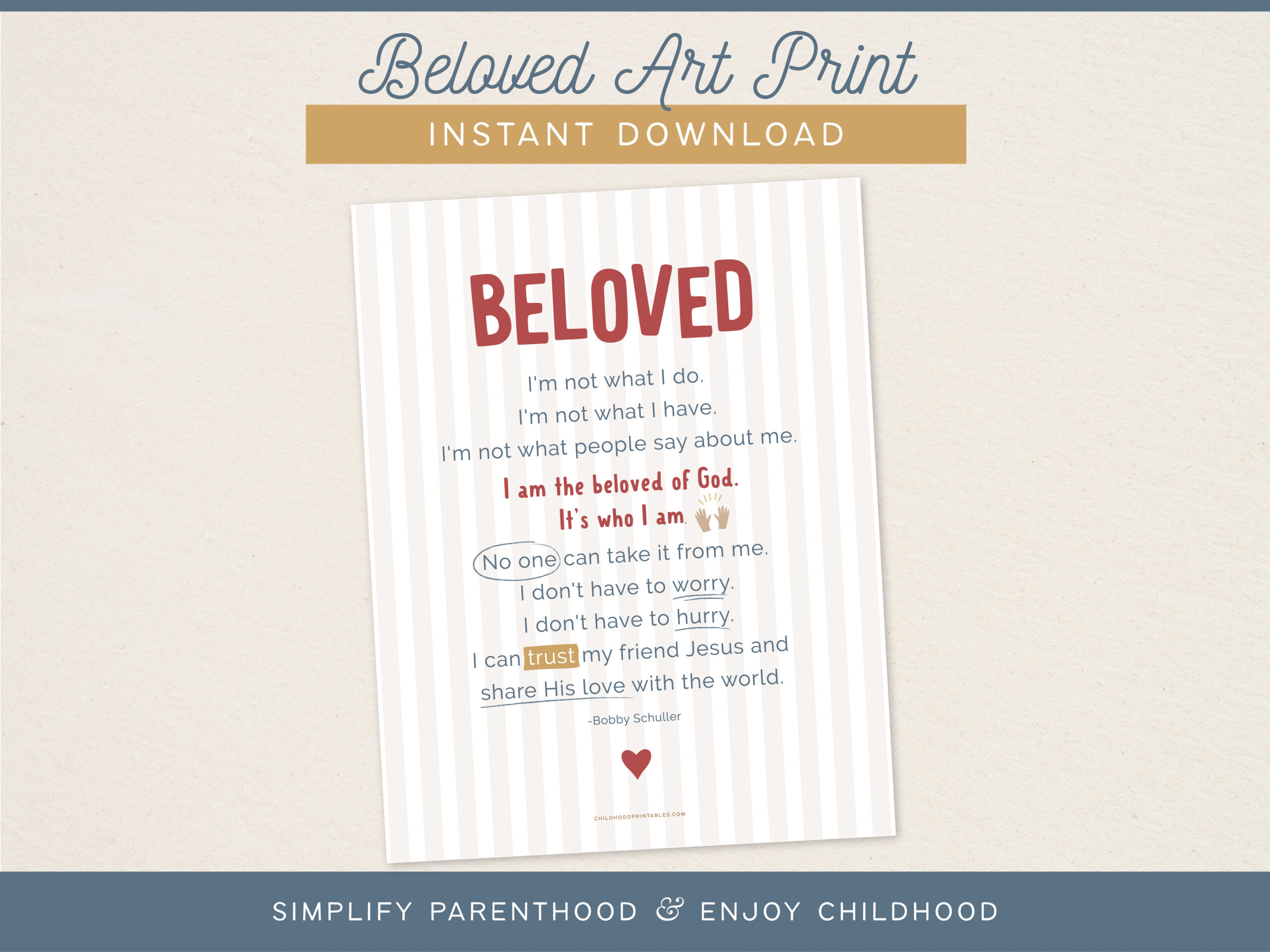 ⭐ Introduce positivity into your child’s life with our Beloved Art Printable, designed to help children know who they are in God. This printable wall art comes in a variety of sizes and is easy to download and display, creating a cheerful atmosphere in any kids’ room. This printable poster reflects the belief that every child is a child of God, helping to instill positive values and mindfulness. Transform your playroom wall art today and watch your children flourish with joy and positivity! Remember you don’t have to worry, you don’t have to hurry. You can trust your friend Jesus and share His love with the world! ❤️