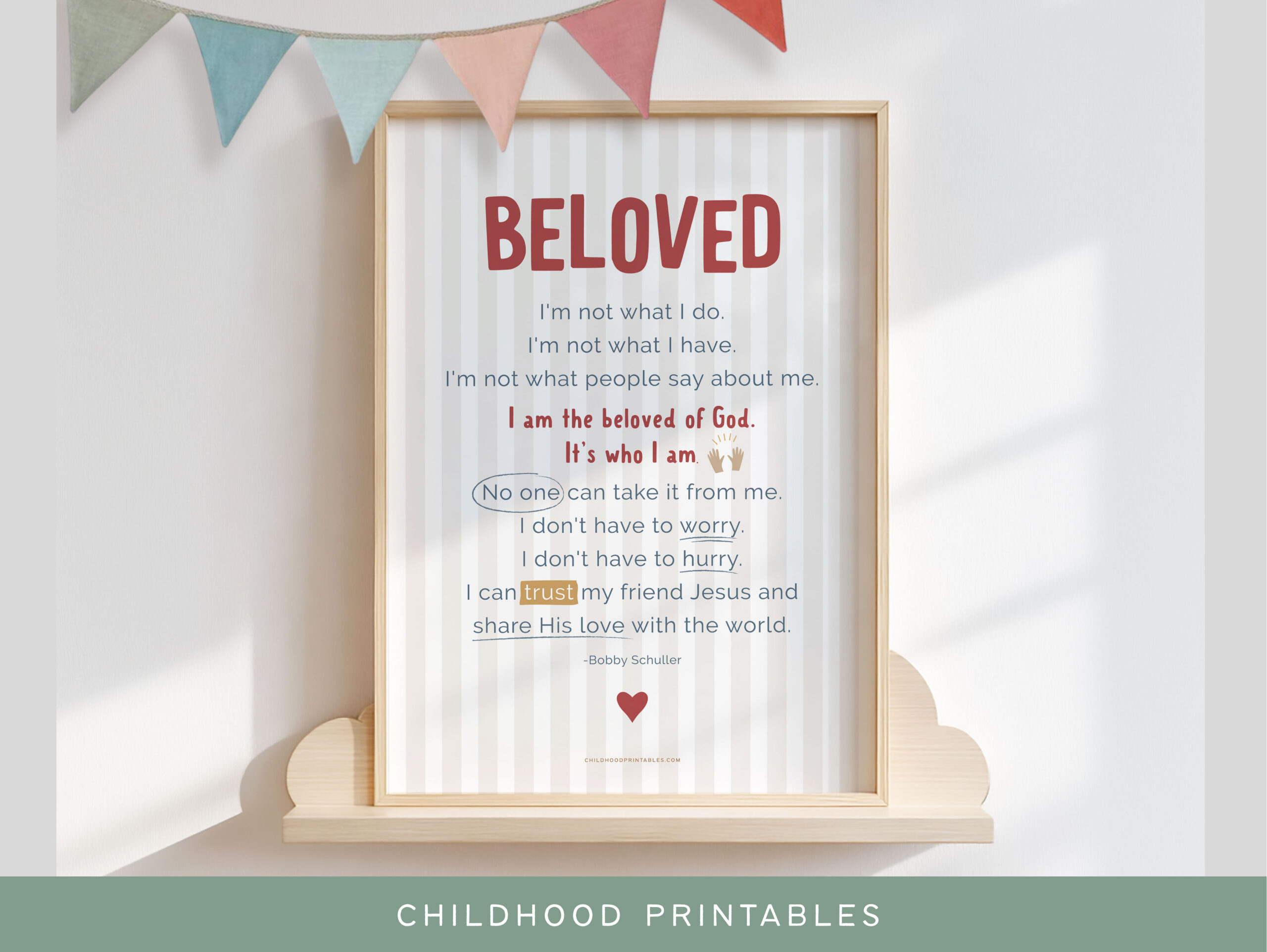⭐ Introduce positivity into your child’s life with our Beloved Creed Art Printable, designed to help children know who they are in God. This printable wall art comes in a variety of sizes and is easy to download and display, creating a cheerful atmosphere in any kids’ room. This printable poster reflects the belief that every child is a child of God, helping to instill positive values and mindfulness. Transform your playroom wall art today and watch your children flourish with joy and positivity! Remember you don’t have to worry, you don’t have to hurry. You can trust your friend Jesus and share His love with the world! ❤️